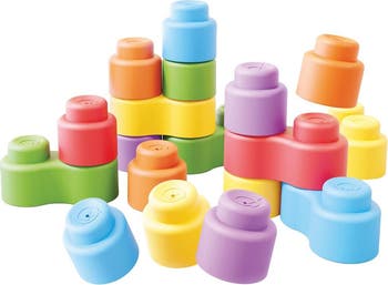 6 months and up. These Soft Stack Baby Bricks are the perfect way to introduce infants to blocks. Their soft outer material and their firm rubber construction make them both pleasant to hold and able to withstand the rigors of infantile sensory exploration. Infants can interact with these blocks in all kinds of ways, and the blocks' easy connectivity means that they may even build something! Includes a zip bag for easy clean up and storage. Set includes 32 blocks.