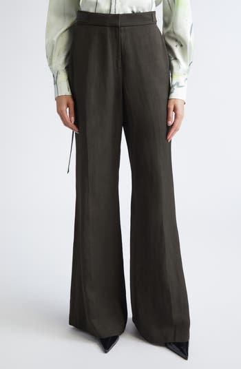 Soft suiting fabric with a touch of linen brings texture and body to these pants cut with wide flared legs dramatically slit up the back to enhance movement. Adjustable button side tabs drape long at each side for an unexpected flourish.