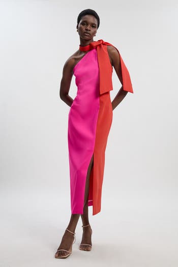 Make a sophisticated entrance in this Karen Millen tailored midi dress that balances contemporary design with timeless elegance. The dramatic bow tie neck detail creates a focal point that draws the eye, whilst the contrasting colour block pattern offers a modern artistic edge.