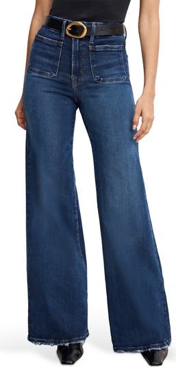 A high waist and superwide palazzo legs creates an elongated silhouette for stretchy jeans offered with a raw release hem for added edge.