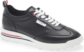 Born out the founder's passion for running, this leather shoe is crafted in Italy with a lambskin-leather upper and cleated rubber sole featuring the brand's signature stripes at the flared heel. A grosgrain heel tab and enameled eyelets continue the tricolor theme.