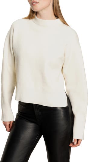 A boxy fit adds relaxed vibes to a waist-skimming sweater topped with a neat mock neck.