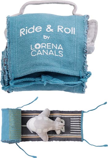Ride & Roll Play Mats Collection – Soft toy vehicles and animals that roll out into interactive 4-meter-long play roads. Each piece features a soft toy cushion made of cotton canvas (available in green, honey, grey, petrol blue, red, or toffee depending on the model) with embroidered details, patch windows, pompom wheels, or textured elements. The mats are printed with detailed roads, runways, train tracks, crosswalks, or ocean scenes, and include braided or tied strings along the edges so they can be rolled up with the toy cushion into a practical briefcase for storage and portability. Available models: Sea Clean Up Boat, School Bus, Airplane, Safari Jeep, Train, and Turtle.