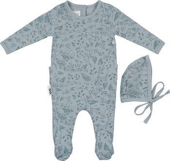 A botanical print vines over this footie and matching hat set that will have baby covered from head to toe.