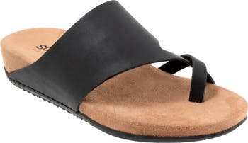 A stylish toe ring and rich leather upper distinguish a summer-ready slide sandal grounded by a cushioned footbed for all-day comfort.