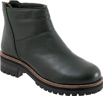 A subtle platform and stacked block heel elevate a rich leather bootie grounded by a durable lug sole.