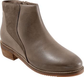 Mixed textures create visual intrigue on a cushioned leather bootie balanced by a plain toe and stacked block heel.