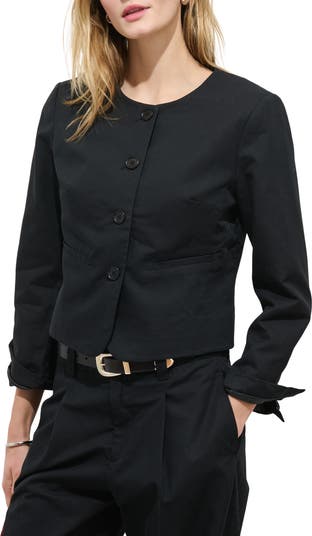 Clean lines define a collarless jacket cut from a breezy blend of cotton and linen.