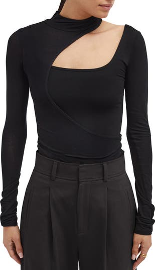 Sheer and opaque jersey overlap on this chic top designed with a high neckline and an edgy cutout.