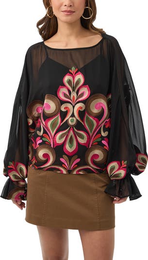 Long sleeve embroidered top with tank lining, boat neck and ruffled sleeve cuffs