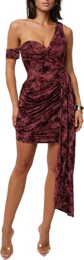 A tonal floral pattern blossoms on this curve-skimming minidress that showcases modern asymmetry.
