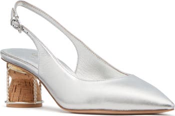 When the event calls for a party shoe, grab a glass of bubbly and hit the dance floor in this pointy-toe slingback lifted by a champagne-cork heel complete with muselet detailing.