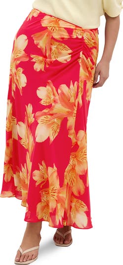 A vivid print is mesmerizing on this maxi skirt textured with rippled ruching for dimension.