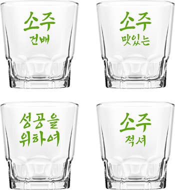 - Set of 4 glasses with Korean sayings: featuring "주 맛있는" (Delicious Soju), "소주 건배" (Cheers Soju), "소주 적셔" (Soju - Soak it Down), and "성공을 위하여" (To Success).