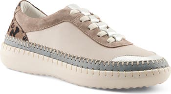 Rows of whipstitching run along the platform of this easy-on sneaker with leather, suede and metallic detailing at the upper.