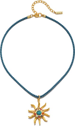 A radiant sun pendant set with turquoise stone and glimmering crystals dangles from a braided cord necklace with coastal-inspired charm.