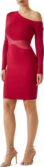 A wavy, sheer mesh inset creates a peekaboo effect for the waist of this shoulder-baring minidress framed by long sleeves.