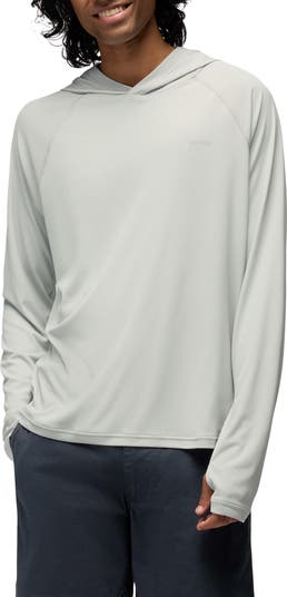 Stretchy, sweat-wicking fabric keeps up at any intensity in this hooded top that offers enhanced UV protection with a light weight to extend your comfort and coverage in the sun.