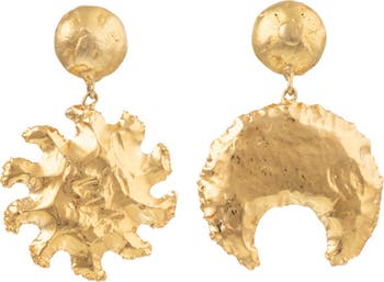 Gold plated brass clip earring "Sol y Luna" - These bold, gold-toned earrings feature an eye-catching asymmetrical design with a textured, organic finish. One earring resembles a wavy sunburst, while the other mimics a crescent moon. A striking statement piece for those who love artistic and unconventional style.