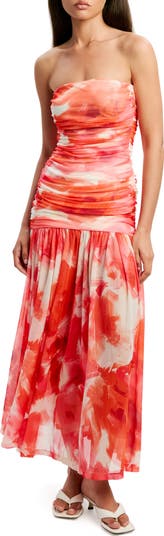 Ruched mesh covered in blurred blossoms gives lots of texture to this strapless maxi dress designed with a dropped-waist bodice that leads to a fluttering skirt.