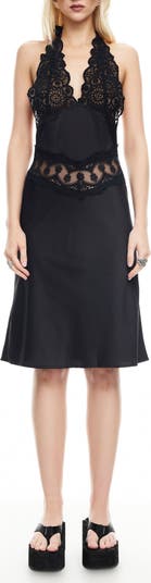 Lacy insets and a dipped halter neckline show off a sassy bit of skin in this open-back dress that's perfect for a flirty date-night look.