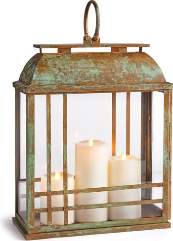 - With an uneven patina, the Solana Lantern has a weather-worn look. With an open, vented design that lets the glow peek out, it adds a warm, rich feel to the room.