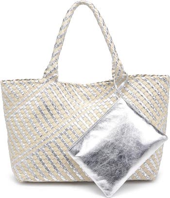 The perfect tote for all of your needs. Crafted with luxurious and lightweight vegan leather, this bag features a woven all-over and a magnetic closure to keep your belongings safe and secure. The inside is unlined and comes complete with an added zipper pouch for some extra storage that can also be used as a hanging accessory. With a handle drop measuring 10”, you will never lose your grip while on the go. Do yourself a favor and get your hands on the effortlessly chic Solana today!