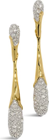 Liquid metalwork plated in 14-karat gold and drenched in pavé crystals delivers contemporary sculptural shine to these teardrop earrings