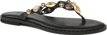 Striking the perfect balance between minimal and statement-making, the SOLANE sandal brings effortless elegance to warm-weather dressing. Crafted with sleek leather straps and a refined thong silhouette, this style is elevated by a curated mix of gold-tone and natural-inspired embellishments that add dimension and subtle shine.