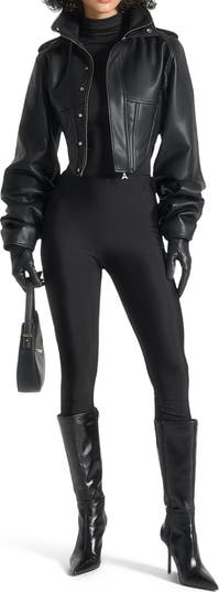 Crafted from luxurious vegan leather, this jacket features intricate corset detailing and a high neck with tacked sleeves. Timeless in design, this jacket adds an elegant touch to any outfit. Made to last, it is a must-have for any fashion-forward wardrobe.