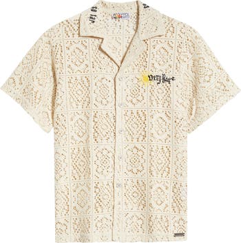 Open crochet invites cooling breezes in this camp shirt crafted from cotton yarns and designed to take you from sunny days to casual nights with ease.