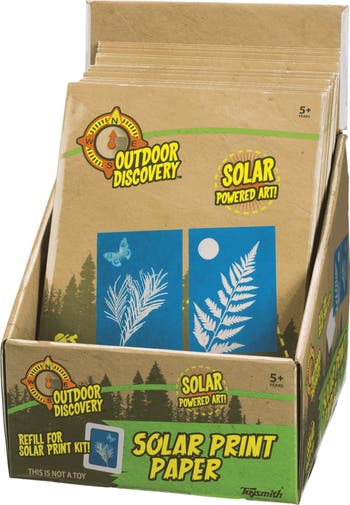 Give your kids fun in the sun and educational opportunities at the same time with Toysmith Solar print paper. This package contains 12 sheets of sun-sensitive refill paper that undergo a chemical change when exposed to sunlight. The images created appear in minutes and are permanent. Made using safe and High quality materials, this solar paper and frame will last. A refill frame is included in the package.