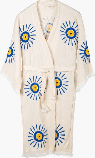Meet your new favorite statement piece: our 100% handmade cotton Robe Cover-Up, with embroidered sleeves with love and serious attention to detail. Soft, breathable, and flowing effortlessly, it’s perfect for keeping comfy while looking effortlessly chic. With eye-catching designs, this Robe Cover-Up isn’t just gorgeous; it’s your vibe booster, bringing positive energy and a touch of protection wherever you go. Whether you’re lounging at home, turning heads at a party, or rocking it as a beach cover-up, it’s the piece that says, “I’m here to make an impression.” Every Robe Cover-Up is crafted with care, making yours truly one-of-a-kind. Dimensions: Length: 48" (124 CM) Width: 28.4" (72 CM) Arm Length: 16" (40 CM) Arm Width: 9.7" (25 CM)