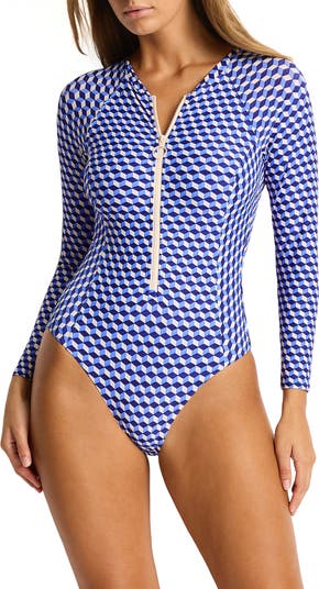 Sporty raglan sleeves frame this sleek one-piece swimsuit that protects you from day to night.