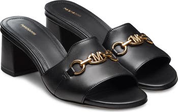 A loafer-inspired topline brings subtle dimension to a Spanish-made slide sandal shaped from rich leather and lifted by a wrapped block heel.