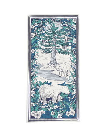 Snowy scenes on this scarf tell the story of Solara, our winter solstice bear. On her way to the forest to mark the longest night of the year and bask in its stillness, she reflects on the beautiful balance between light and dark. In an icy teal, cobalt and ivory palette, this light and breathable scarf is elegant and flowing and will add a touch of magic to your outfit.