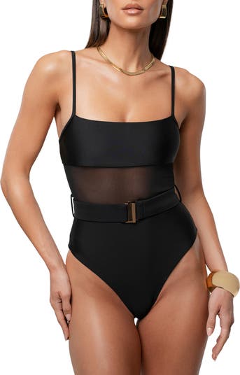 A sleek belt adds sophistication to this one-piece swimsuit made with a sheer panel and a cheeky back.