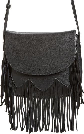 Swingy sueded fringe adds to the easy boho charm of a curved-flap crossbody bag in pebbled-faux leather.