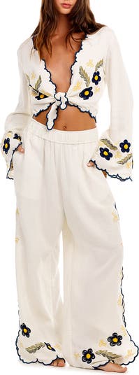 A contrast trim and flared sleeves brings tropical vibes to this cover-up crop top made with a flirty tie front and beautiful embroidery details.