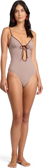 A tie-front keyhole cutout and contrast binding give our Soleil one-piece its distinctive look. The suit is made from stretch tricot fabric with fixed triangle cups, adjustable straps, and a high cut at the leg. Perfect for the summer.