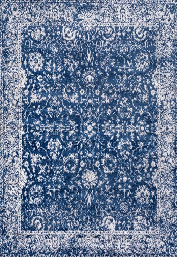 - Mingled shades of blue and navy in the background give this rug a vintage texture