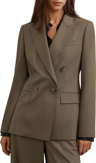 Make your intentions for the corner office known in this polished double-breasted blazer tailored from a wool blend with peaked lapels and a back vent to ease the steps throughout your busy day.