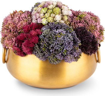 Sophisticated and striking, the Solene Gold Sedum Arrangement features a captivating blend of purple-hued sedums in varying shades, each crafted with remarkable attention to detail. Set in a luxurious gold-handled bowl, this arrangement exudes timeless elegance and bold charm. Its rich colors and refined design make it an ideal accent piece for enhancing any room with a touch of opulence and beauty. A lasting luxury, timeless and unrivaled.