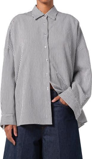 Dropped shoulders enhance the relaxed oversized fit of this inky striped shirt punctuated with a tuckable high/low hem.
