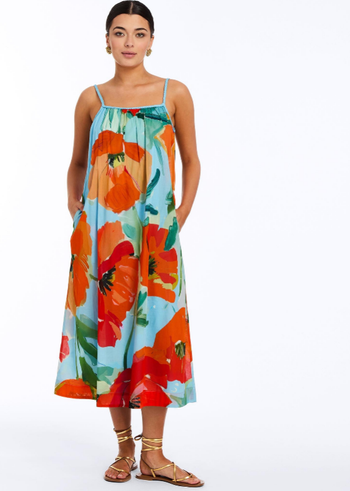 Midi-length daytime dress featuring a straight neckline. Adjustable straps with faux bow details over top of shoulders. Shapeless full-body silhouette. 2-inch hem allowance for easy lengthening.