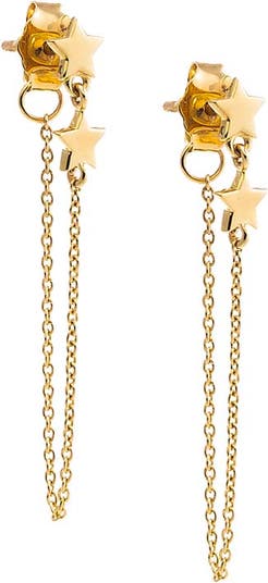 14K gold front-back chain stud earrings with double star detail. Measures 1" in chain length.