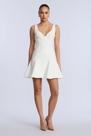 Flirty fit-and-flare mini dress crafted from smooth stretch crepe. Designed with underwire cups and darted seams for subtle shaping through the bodice. Finished with a flared skirt and hidden back zip for an easy, playful fit.