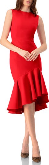 Sleeveless red mermaid midi dress with a round neckline.