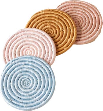 Stylish and modern, this solid mixed set of 4 coasters is the perfect tabletop item for entertaining, gifting giving, or curating the perfect table setting for your indoor and outdoor dining. Our coasters are handcrafted in Rwanda with a time-honored weaving technique passed down from generations of artisans. 4”diameter Set of 4 coasters Blue, pink, mauve, and tan color Made from strands of sisal wrapped around bunches of sweetgrass A handmade housewarming gift for both men and women, the Solid Mixed Set of 4 Coasters Tan adds a nice touch to any tabletop!
