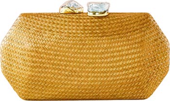 Handwoven by artisans from natural palm fibers, this compact octagonal clutch is framed by gilded stone clasps for an earthy yet sophisticated look. Smooth satin lining and a chain strap add polished style. Slight variations in weave and color make each bag one of a kind.